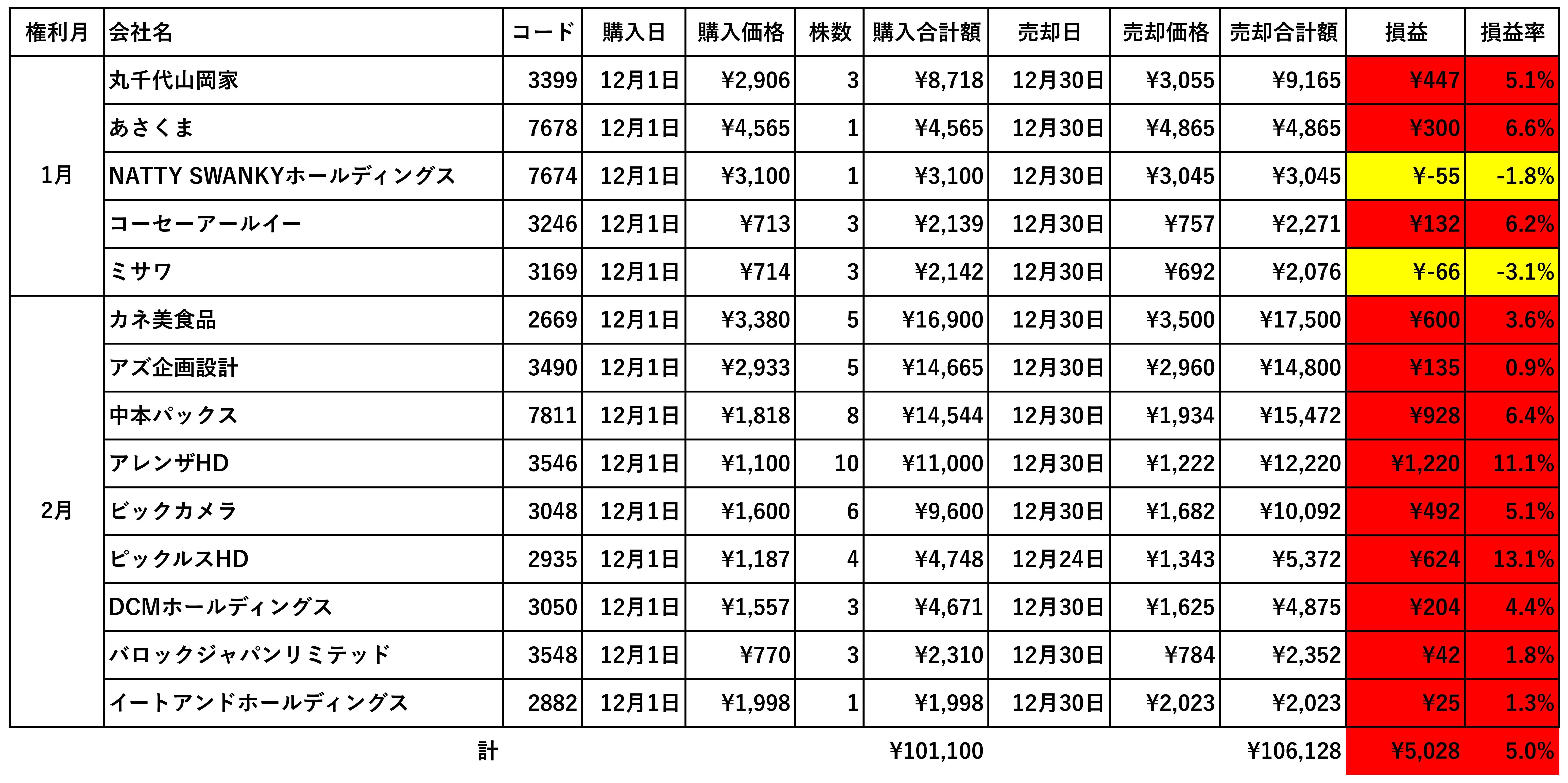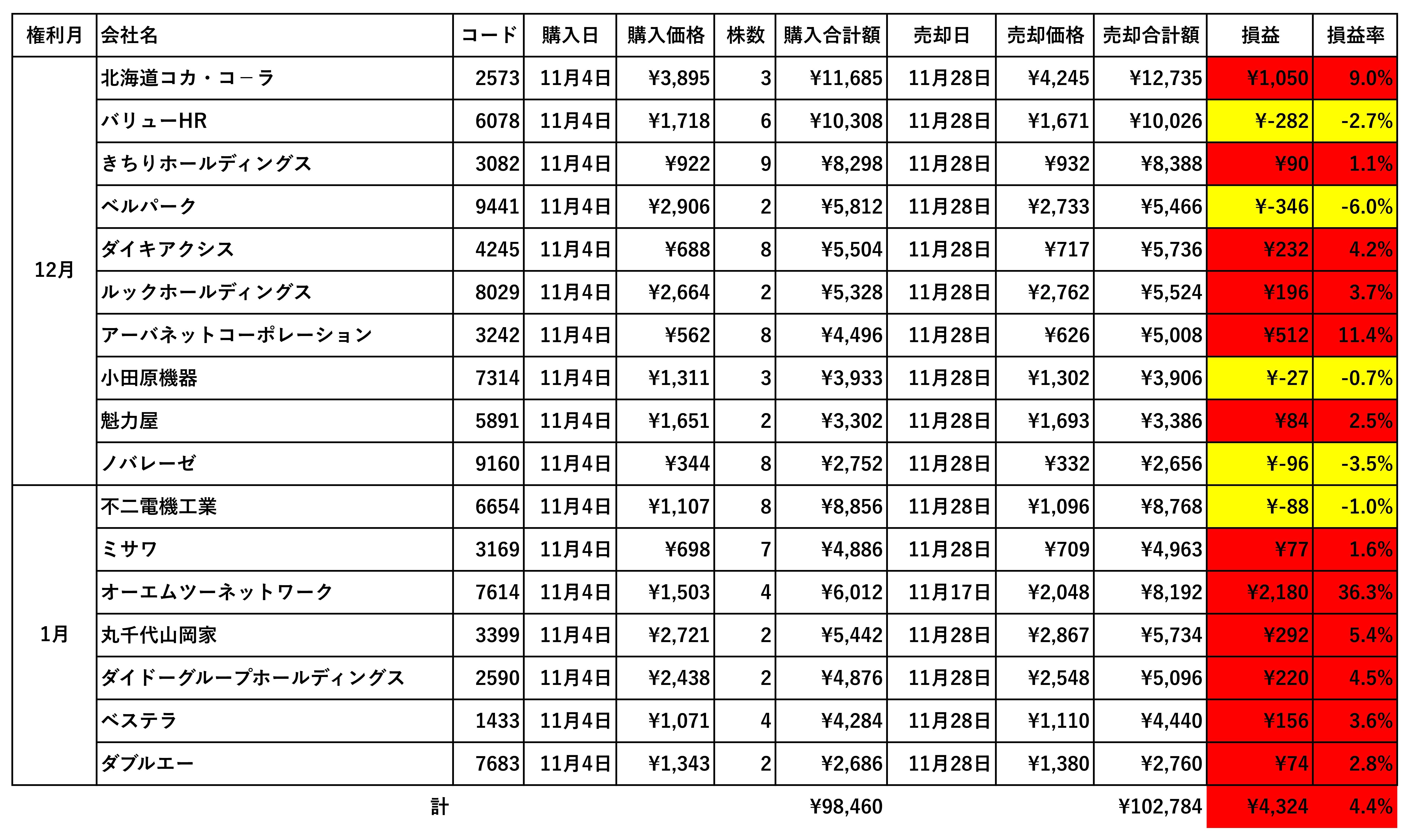ピックルスHD(2935)は12/3に株主優待拡充の発表から続伸。含み益が13%を超えたタイミングで利確。アレンザHD(3546)は特に材料もないところから右肩上がりで伸び続け、大きく利益を稼いでくれました。