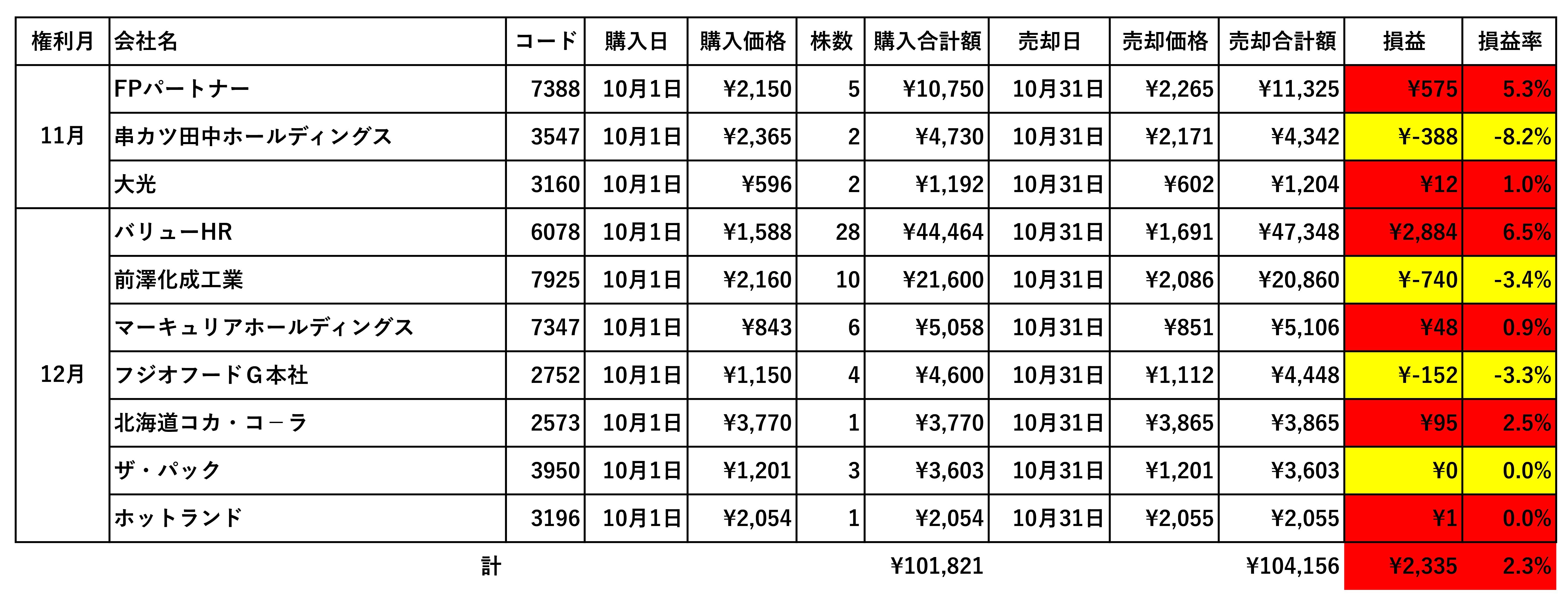 ただ、10月は当手法での有望株があまりに少なかったために、かなり無理に資金を入れた月でもあり、マイナスを出した銘柄はいずれも、他の月であれば買わないか、少なくとも投入割合がもっと小さくなる銘柄でした。