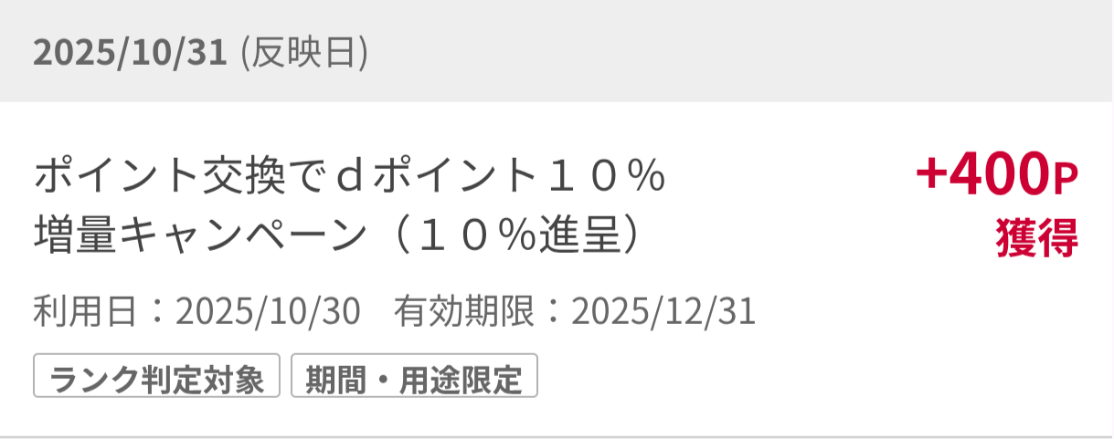 ・特典:交換されたdポイント合計の10%相当を増量し進呈