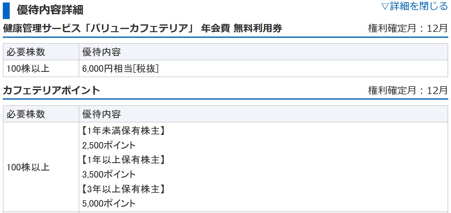 100株保有でバリューカフェテリア年会費無料利用券+カフェテリアポイント2,500pt
