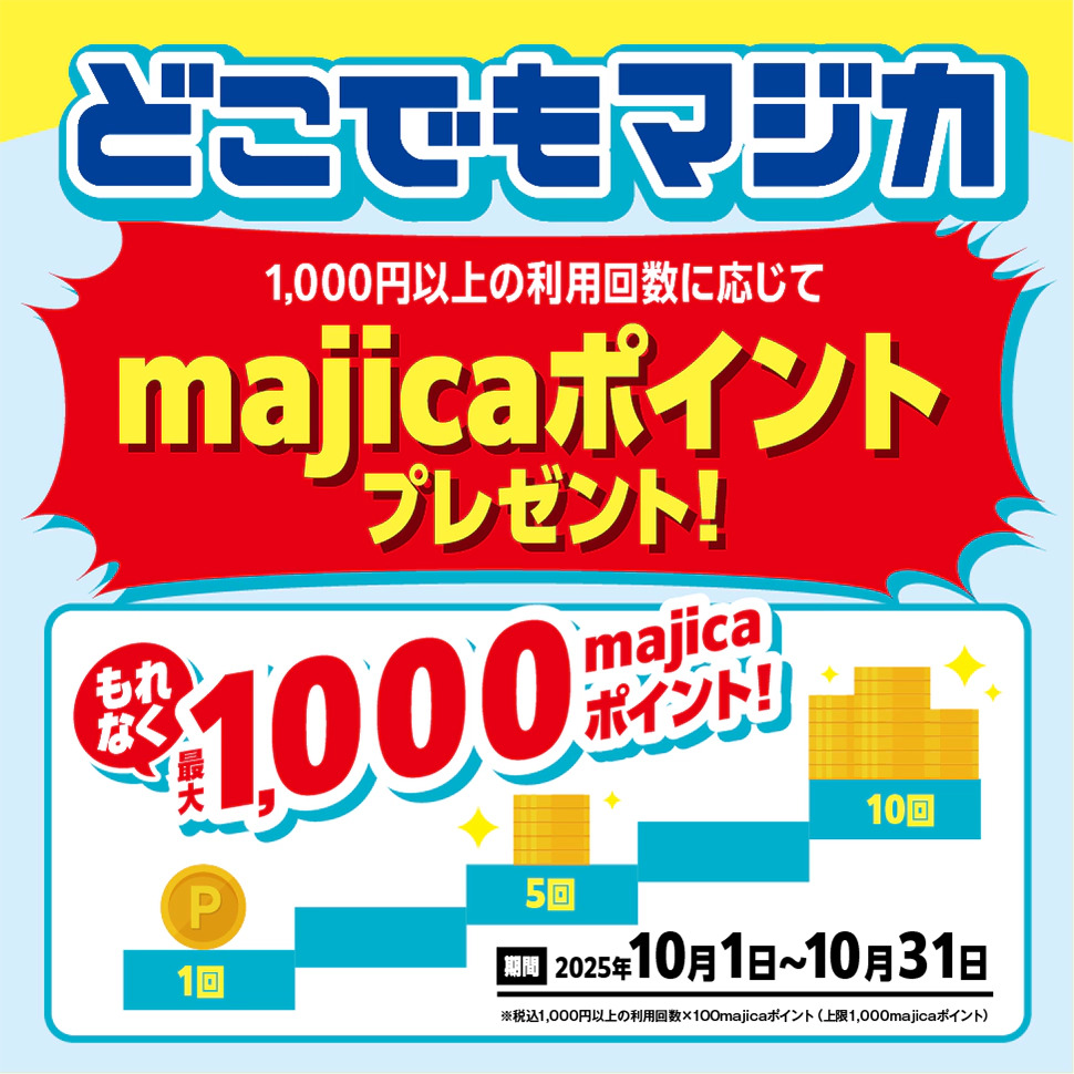 どこでもマジカを1,000円(税込)以上ご利用すると100majicaポイントを、最大10回のご利用分まで(=最大1,000majicaポイント)進呈=最大還元率10%